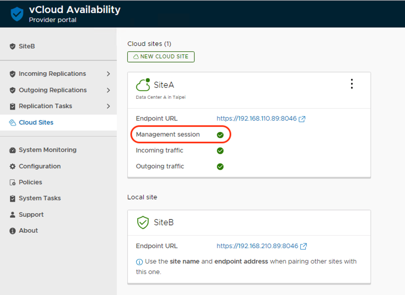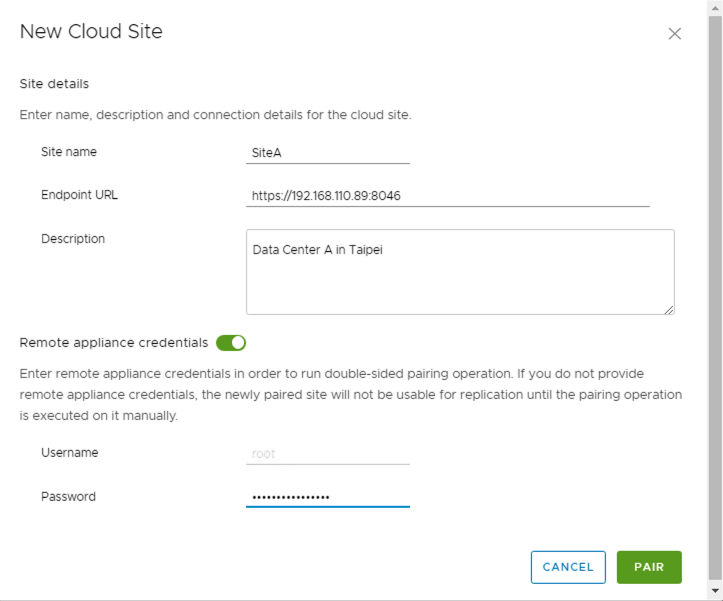 當我們在兩個站點都各自安裝完畢和設定完成相關vCAV C2C服務後,我們接下來就是要建立站點間vCloud Availability vApp Replication Manager的信任關係。我們可以選擇在某一個站點來完成這個動作即可,登入https://Appliance-IP-Address:8046