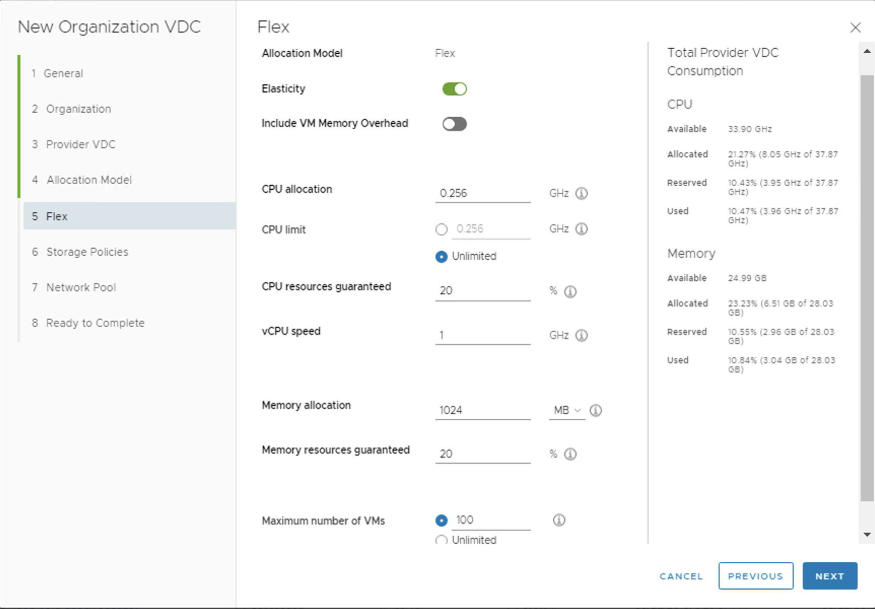 - Memory Allocation (global per VDC)在此OVDC中全部虛機運行時可用的最大記憶體數量(從PVDC而來)。