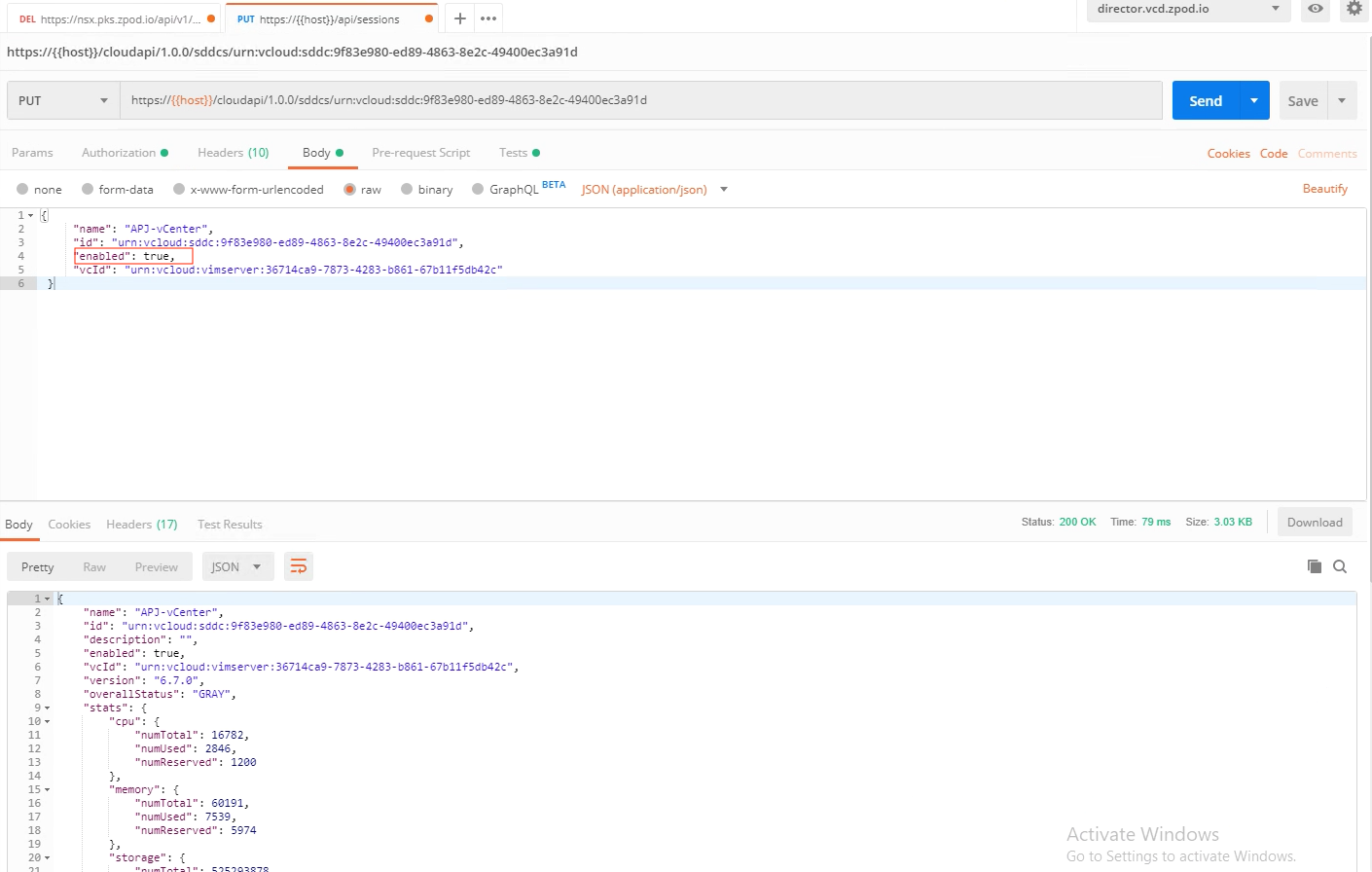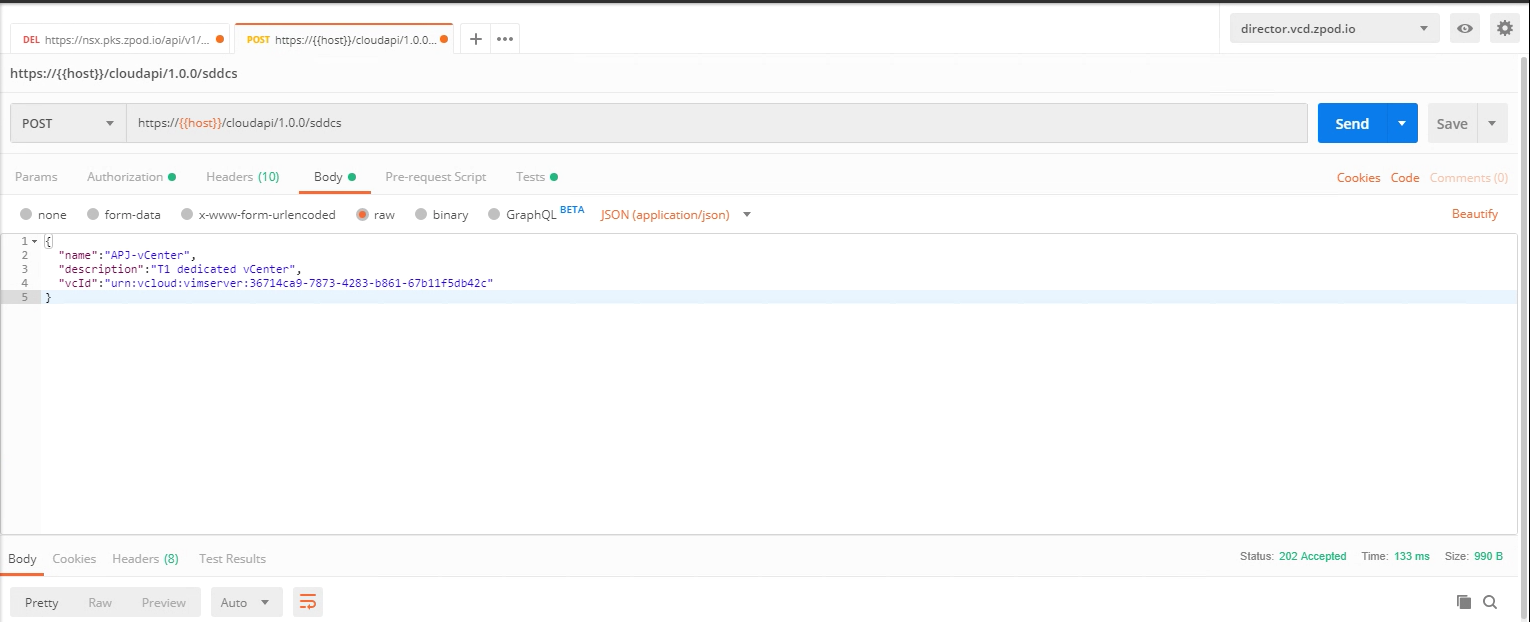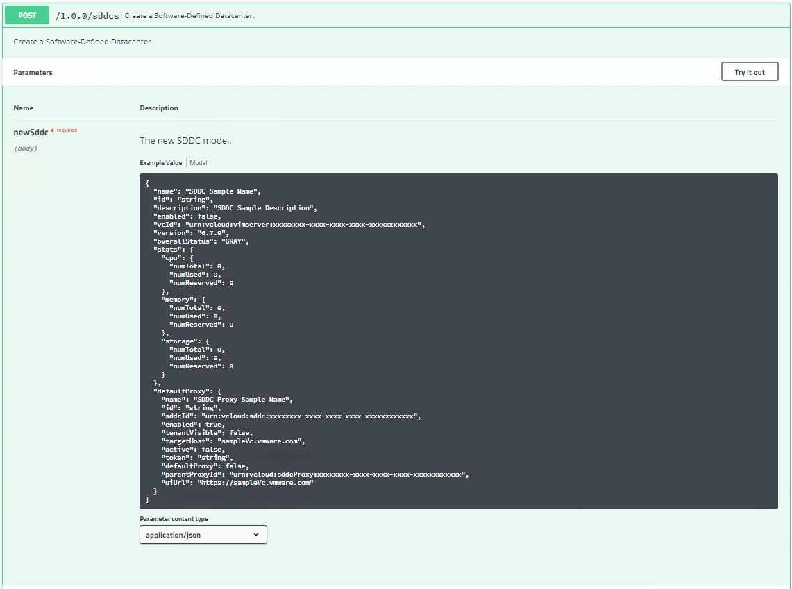 利用POST /1.0.0/sddcs指令,新增SDDC物件,可以參考vCD API文件了解相關指令所需參數: