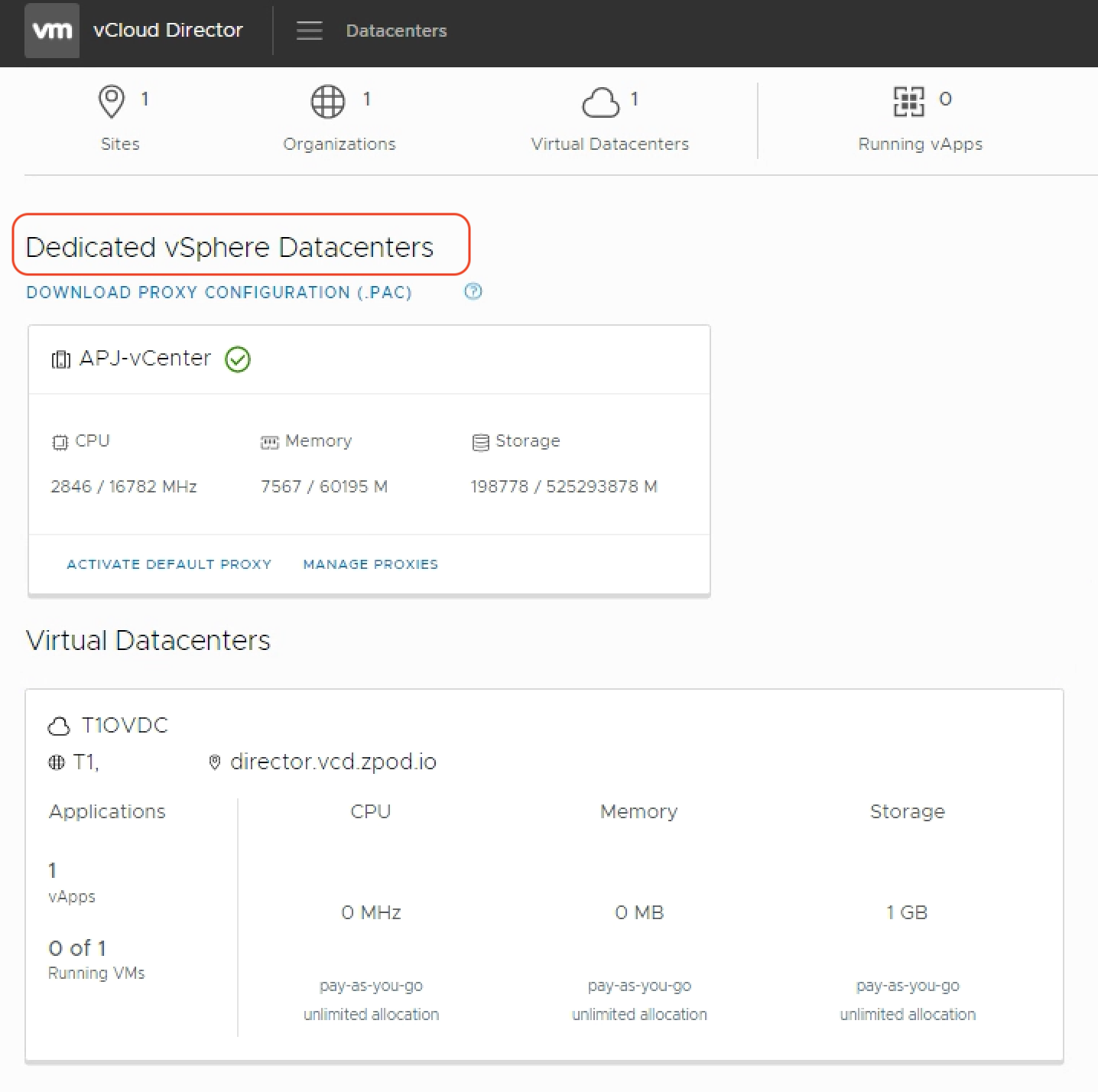 上述命令執行完畢後,我們以”T1″租戶管理員角色登入到vCD,可看到在“Dedicated vSphere Datacenters”類別的Datacenters下,有一個vCenter的SDDC被建立出來,但還沒被啟用(紅色圈圈所示)。