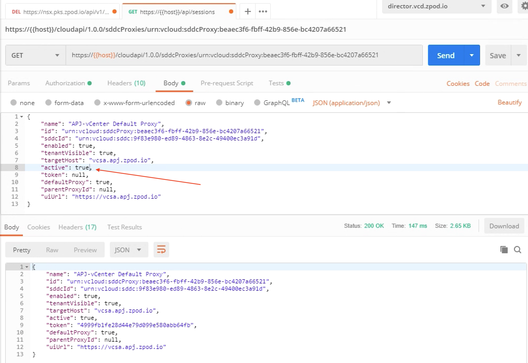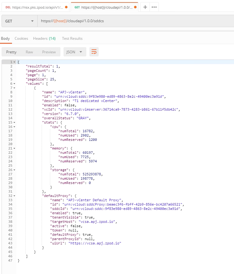再利用之前下過的GET指令查看一下SDDC內容,我們會發現已經成功建立SDDC元件,並且該SDDC已經封裝了一個vCenter元件: