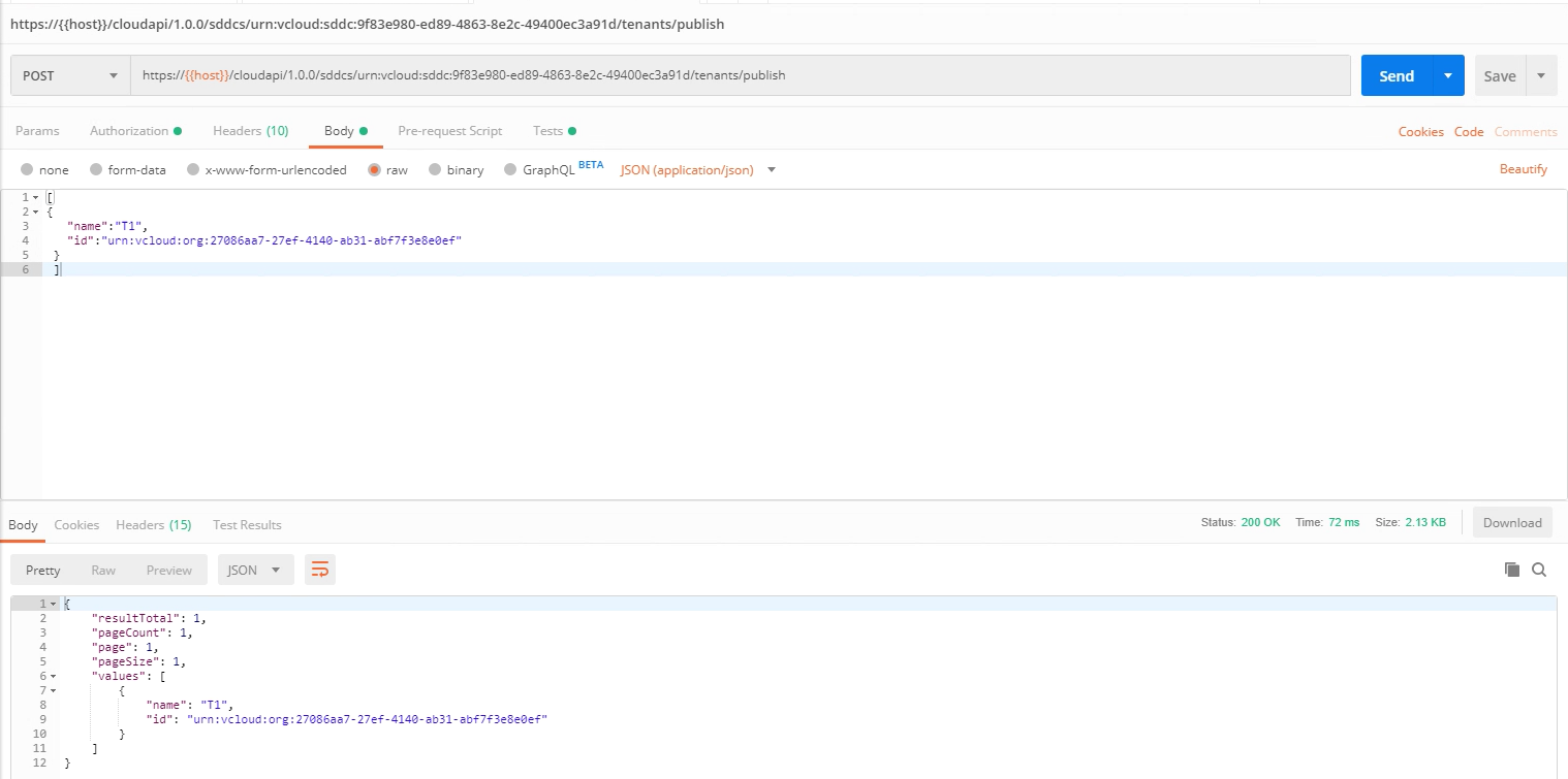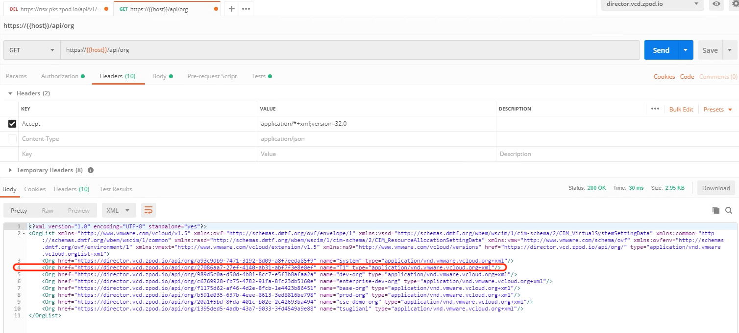 首先,我們要先獲得發布對象的組織ID,由於我是要把剛剛生成的SDDC發佈給”T1“這個組織,所以我需要先得到”T1“這個組織的ID,利用GET /api/org命令,將所有組織資訊顯示出來,然後記錄下來”T1″的org ID,如下: