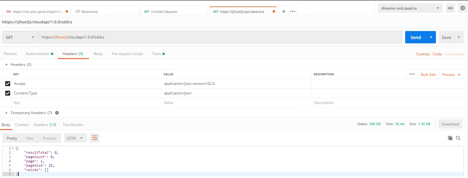 用GET指令查看目前在vCD裡面,是否已經存在任何SDDC元件:(以下查詢結果為”0″個,表示vCD裡目前並沒有任何SDDC元件存在)