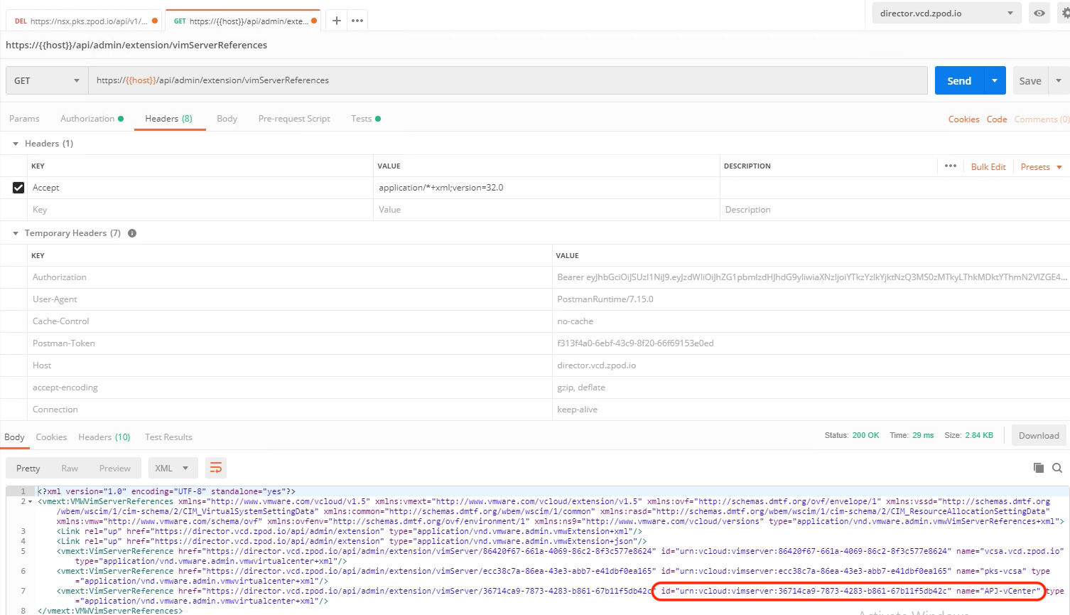 我們要在vCD中建立一個以剛剛新增的vCenter為主體的SDDC物件,所以我們必須先獲取vCenter的”vcID”,請參考vCloud Director的API文件中,”Finding Available vCenter Resources“章節,裡面有說明如何用REST API來得到此訊息: