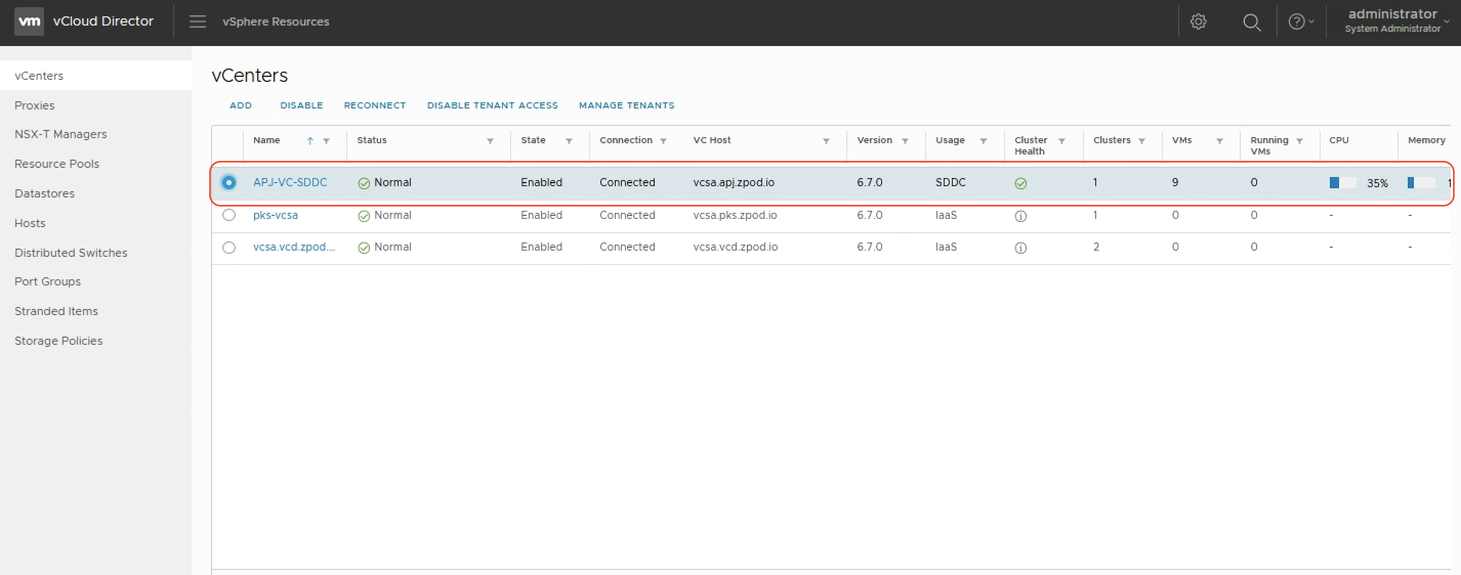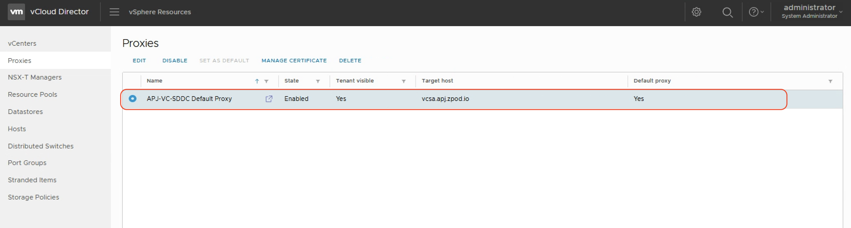While attaching the vCenter Server instance, you can also create a proxy for it. When we choose to “Enable tenant access” when adding the VC in previous step, we’ve already added this proxy.