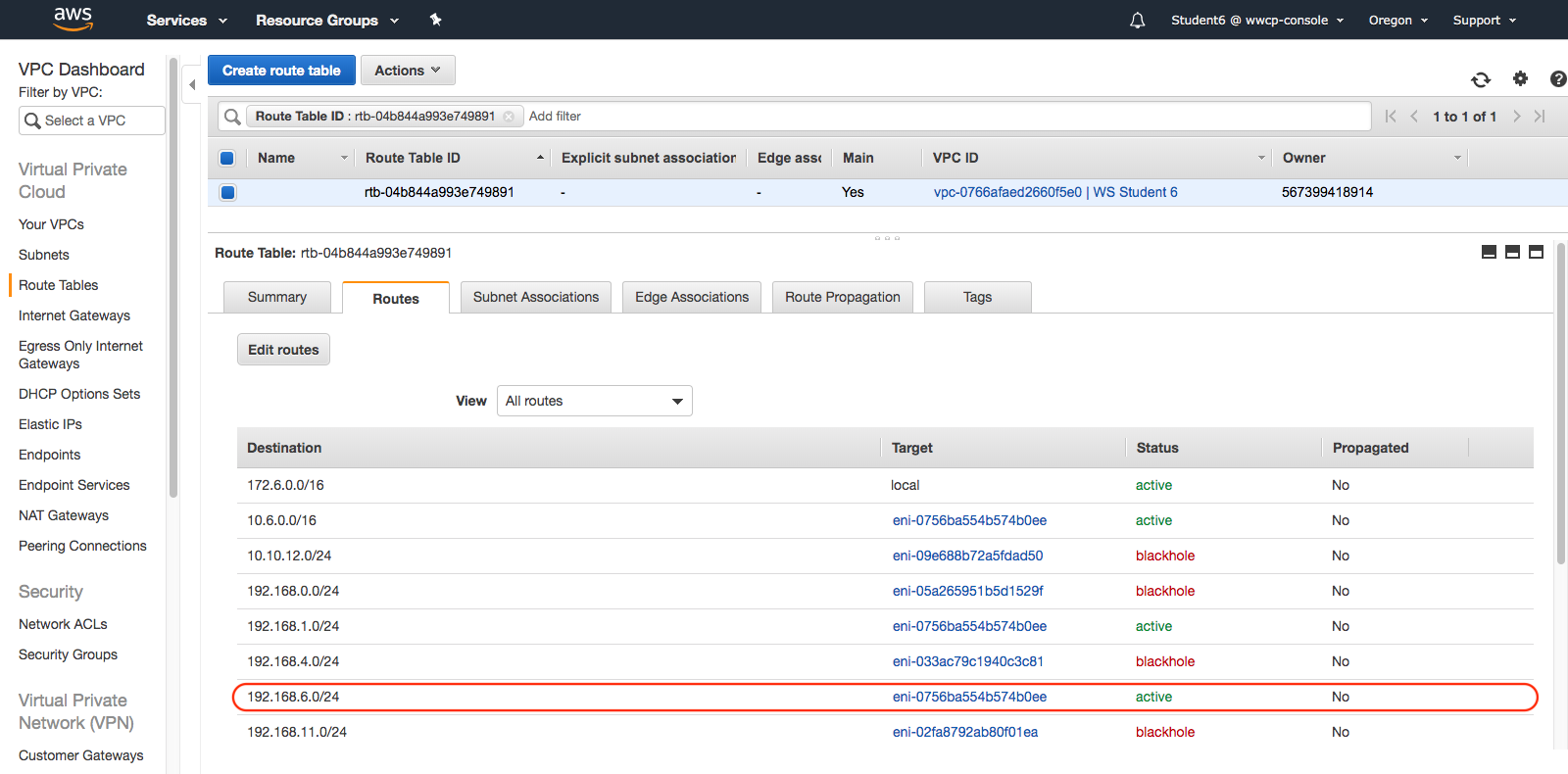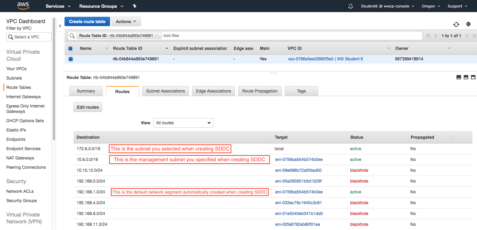 You can see VMware added one 192.168.6.0/24 entry right away automatically in AWS VPC Route Tables, this AWS VPC can then route network traffic to your VMC SDDC via the “Active Network Interface” target. (eni-xxxxxxxxxx)