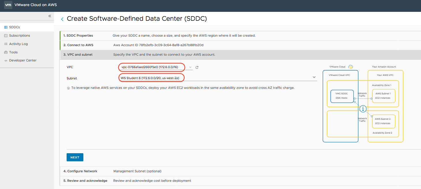 Enter an IP address range for the management subnet as a CIDR block (or leave the text box blank to use the default, which is 10.2.0.0/16. Using this information), VMware will create a new VPC within the VMware-owned AWS account for this SDDC. This VPC will be created using the SDDC management IP address range provided here and several subnets will be created within this VPC. We use the 10.6.0.0/16 subnet for example to deploy our VMC SDDC.