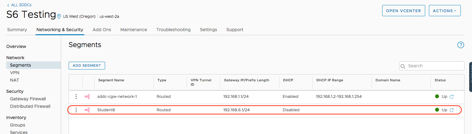 Click ingle host SDDCs have a default logical segment which name is “sddc-cgw-network-1”. (If this default segment causes a conflict, delete it and create a new segment) showing as below screen captured.