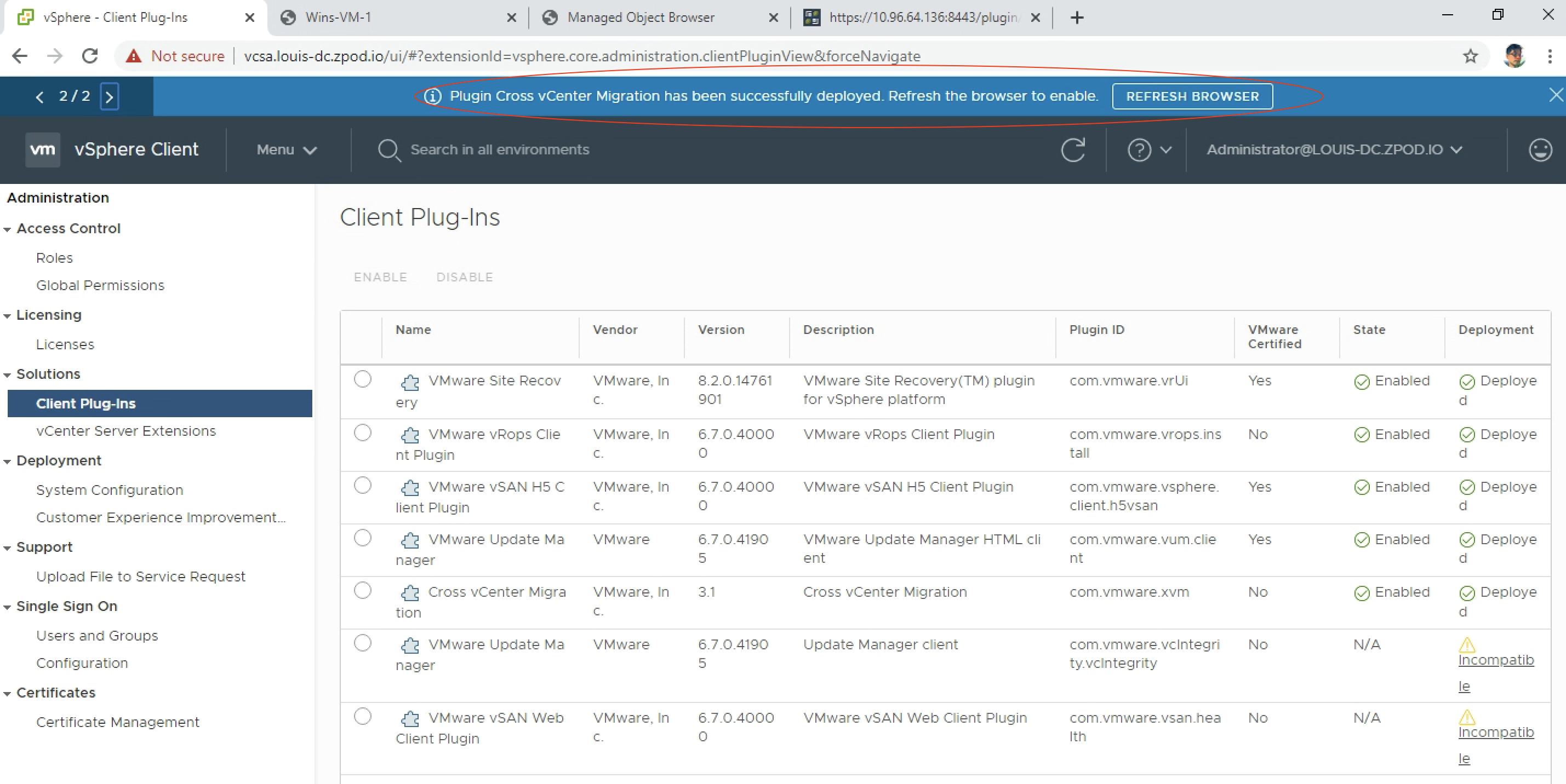 程式執行完畢我們可以看到vCenter Server HTML5介面上有訊息顯示說系統有一個新的plugin已經被成功的裝上,這時我們需要登出再登入一次,才可以看到多出來的選項: