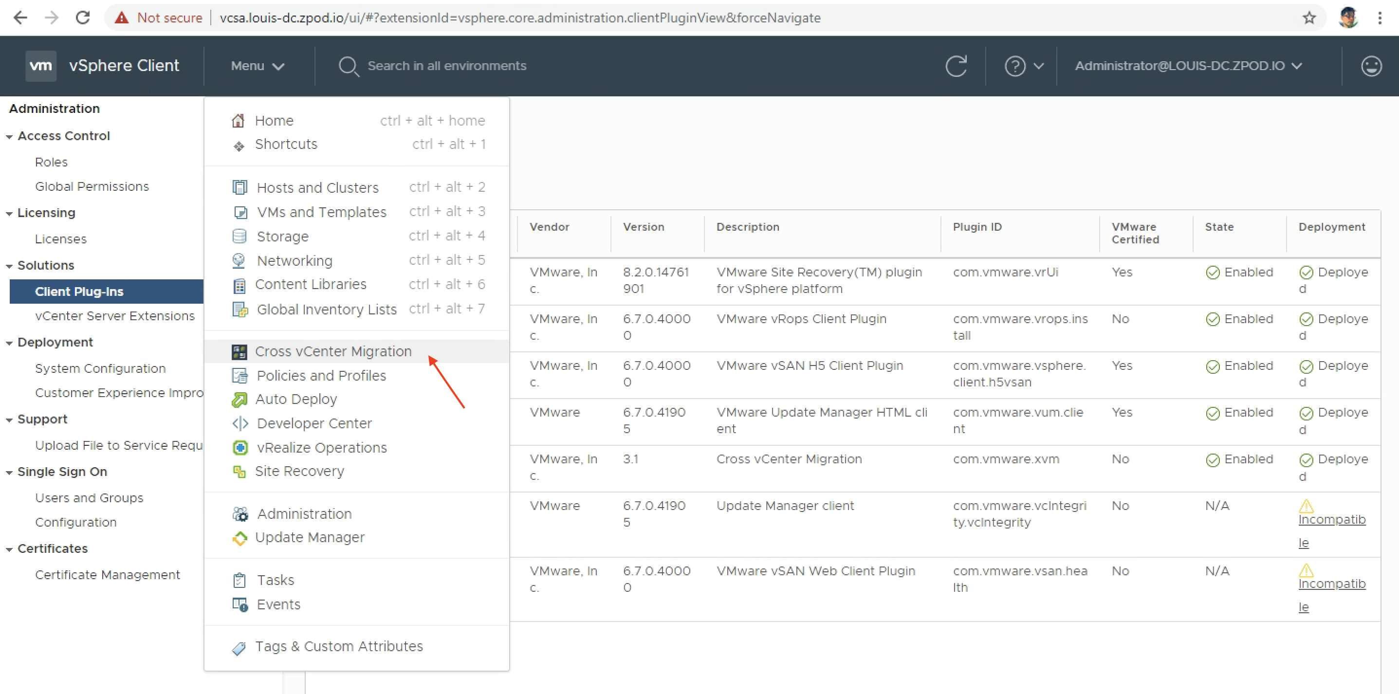 再次登入vCenter Server後,我們可以看到新增的”Cross vCenter Migration” UI選項: