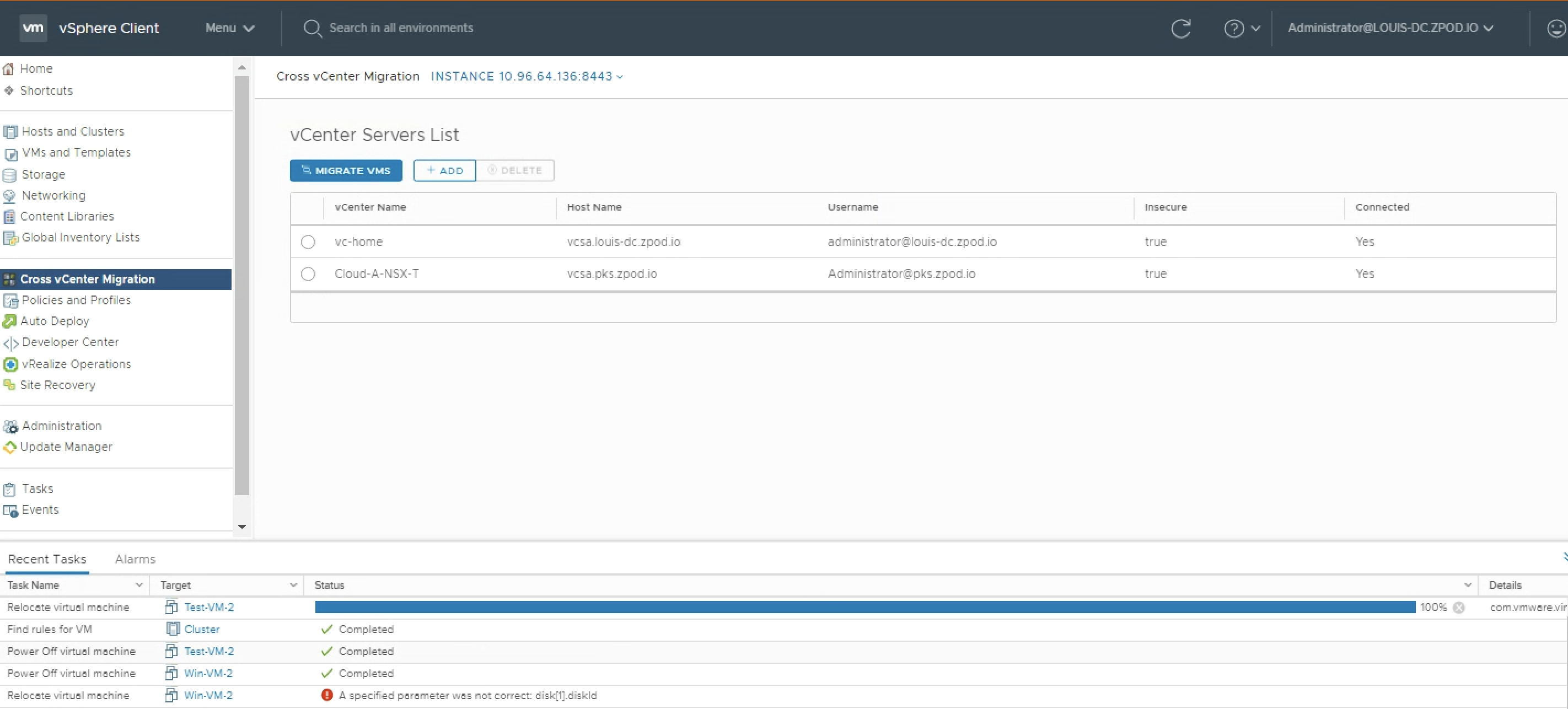 首先將其它你要遷移到的目標環境的vCenter Server註冊進來,底下加進來的是配置有NSX-T Opaque Network為Port Group的vCenter Server: