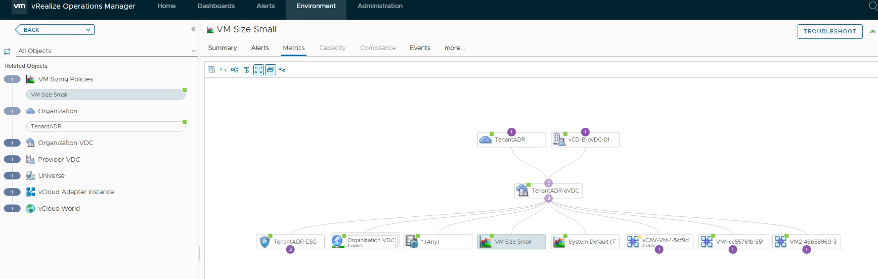lastly, let’s examine the “VM Sizing Policy” metric:When selecting the specific size policy, it shows which Organization VDC has been assigned with that policy.