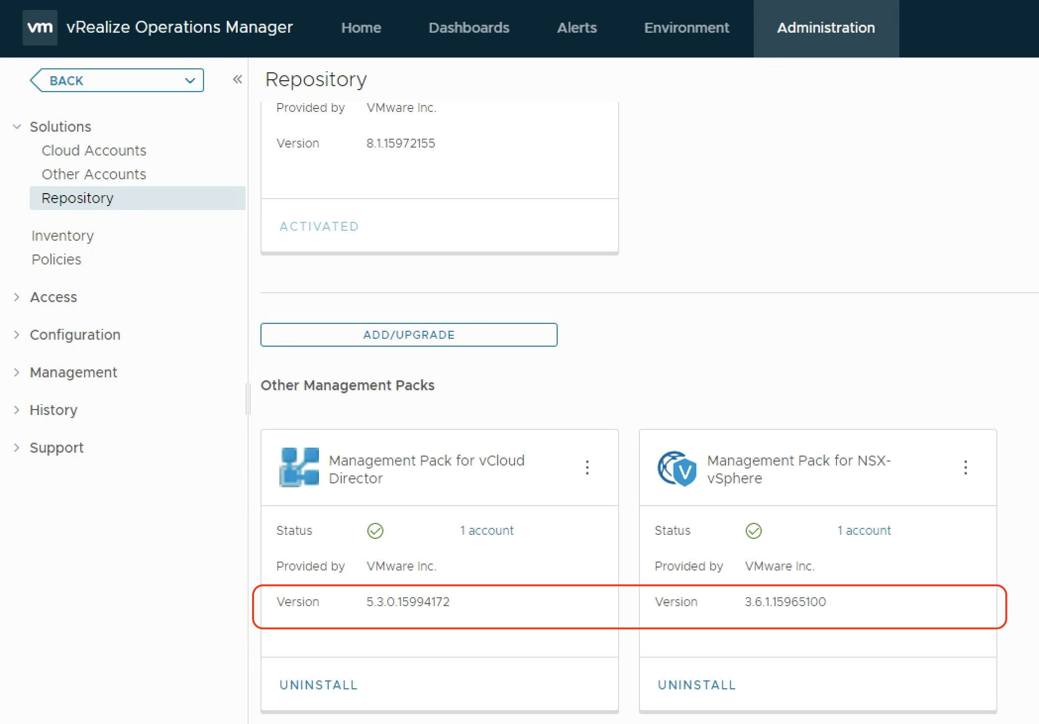 Notes: Management Pack for vCloud Director 5.3 is supported only on vRealize Operations Manager 8.1.