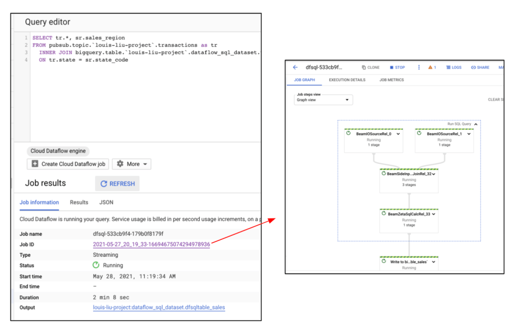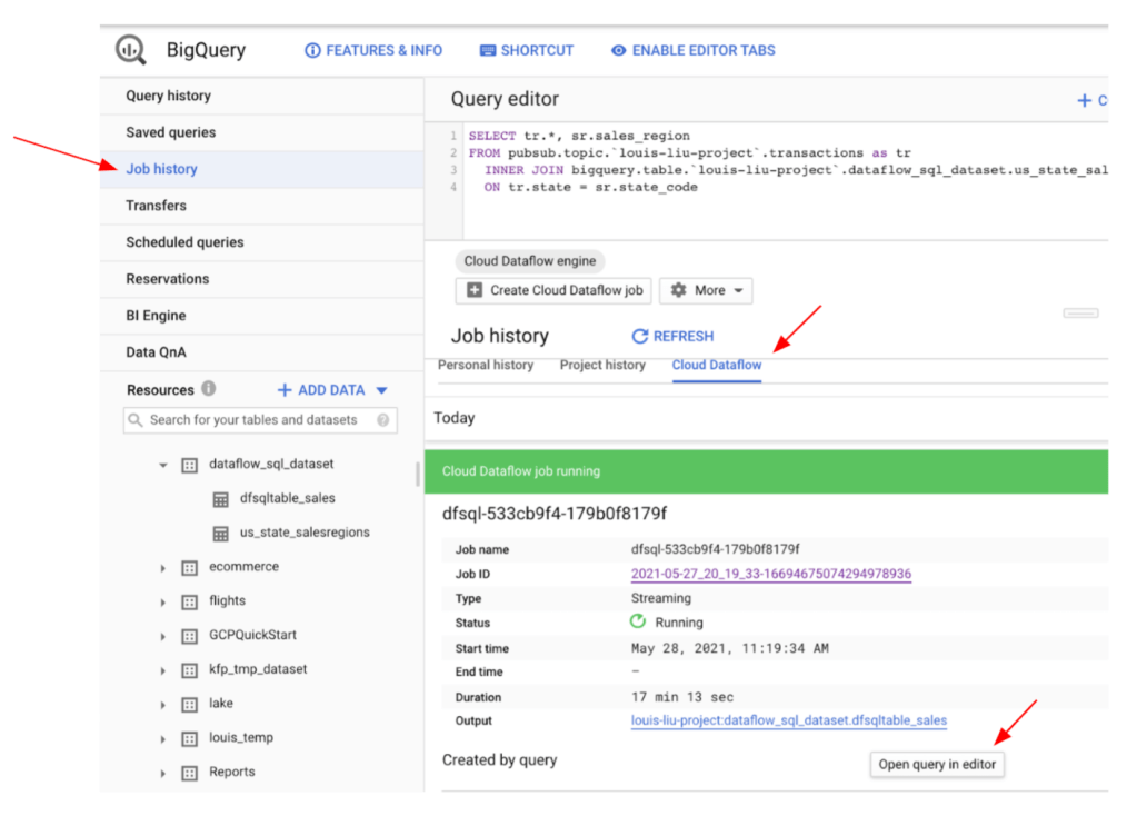Dataflow Job執行後,可在BigQuery GUI中查看Dataflow資料處理流程和狀況