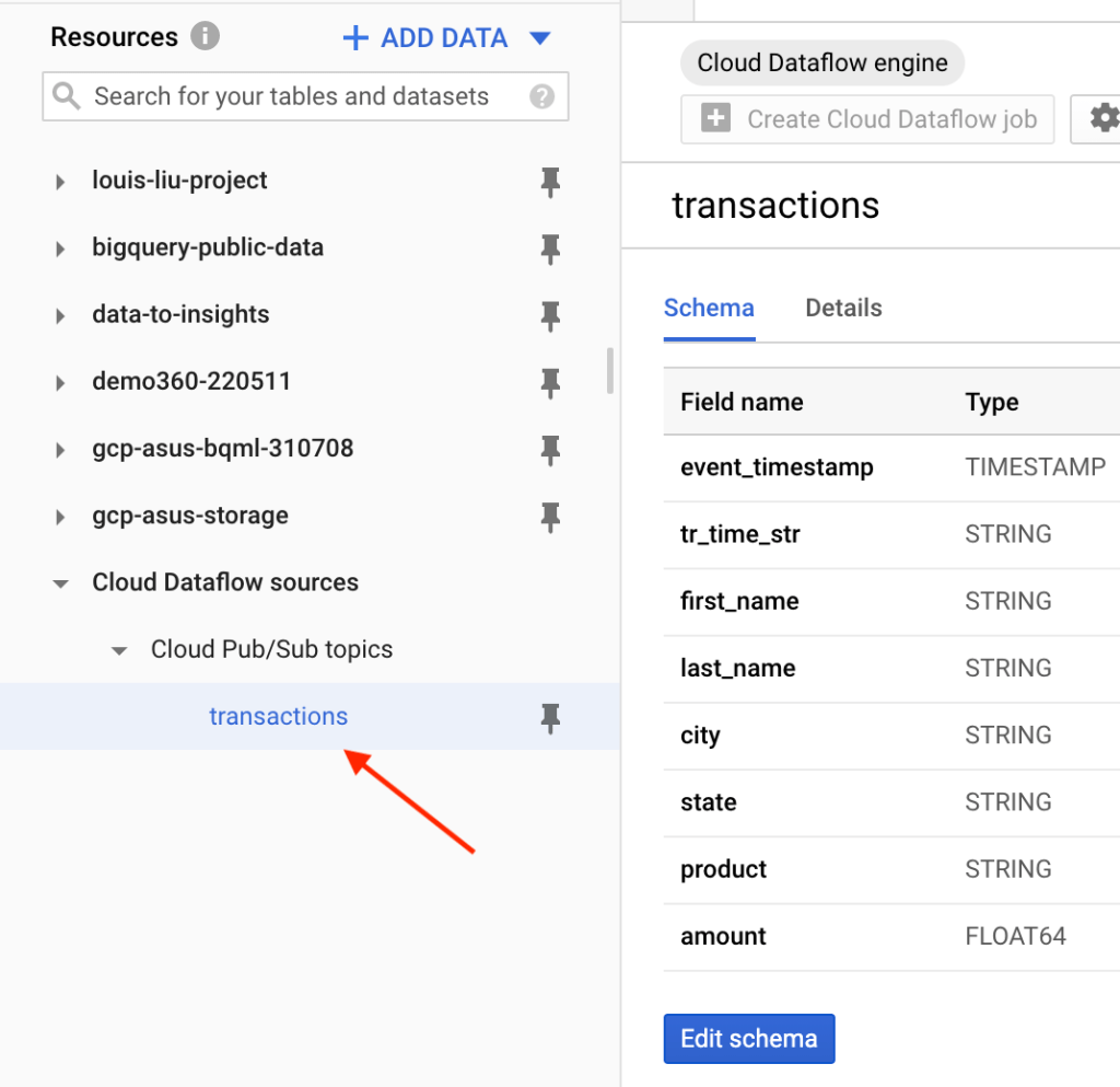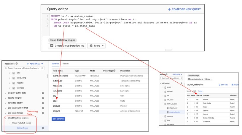 上圖的左邊為BigQuery需要即時讀取的串流資料來源資料表,內容包含客戶名稱、客戶購買的產品和購買時間、價格、城市、州別等欄位。此資料表的內容我們會以Python程式將模擬的客戶相關購買資訊即時發佈到Pub/Sub的“transactions”主題;另外BigQery需以設定外部資料集為Pub/Sub的方式來獲取客戶購買資料,以供Dataflow SQL可以做資料的即時處理。