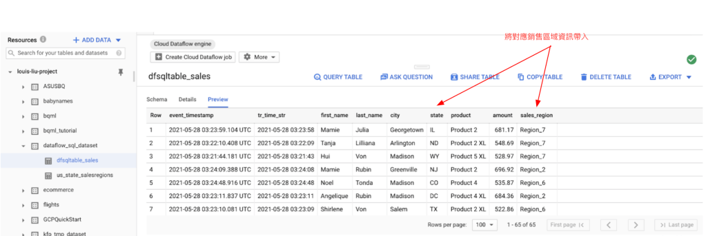 上圖的右邊為事先已存在BigQuery的銷售靜態資料表,內容為美國各州的代號、州名和它們所對應的公司銷售區域。