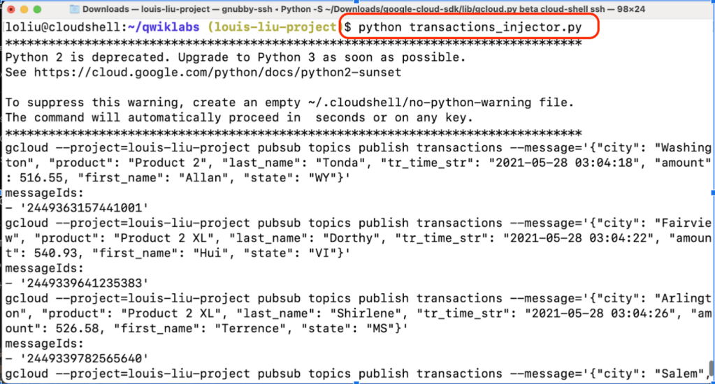 執行python腳本動態隨機產生客戶購買產品資訊,這些資訊會被發佈到之前已建立的Pub/Sub的”transactions”主題中: