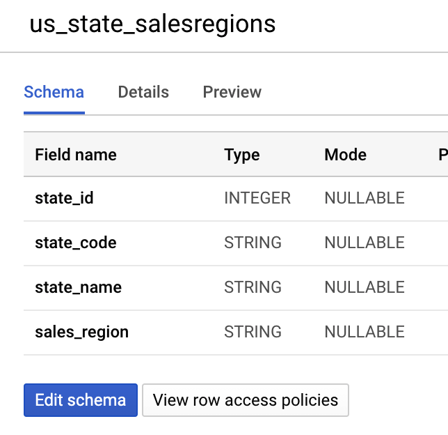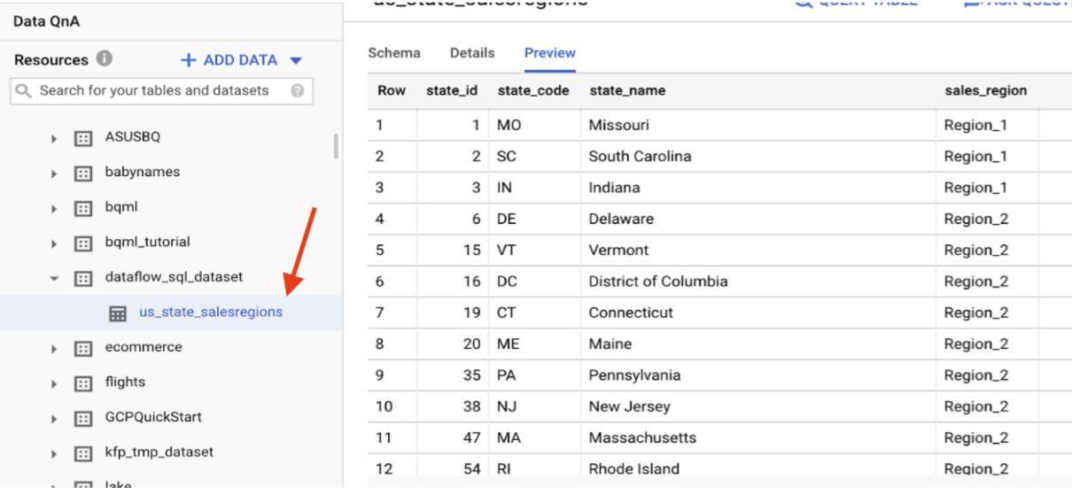 在BigQuery建立靜態銷售資料表”us_state_salesregions”: