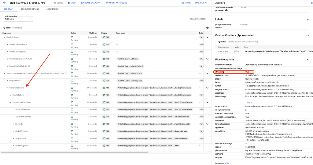 Dataflow GUI streaming insert