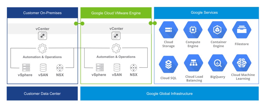 Google與VMware的合作除了可以在Google Cloud環境裡提供原汁原味的VMware vSphere虛擬化平台(Google的名稱叫做Google Cloud VMware Engine,簡稱GCVE,Google也將此環境稱為雲上的Private Cloud)之外,GCVE上面的VM也可以就近與GCP上面的各種公有雲服務緊密整合,如此一來,VM就擺脫了以往只能自己在vCenter的管理範疇下提供有限功能侷限了,從遷移到維運再到整合公有雲各種服務的三個階段,使用者不用等到要完全學會所有的GCP的管理方式,就可輕鬆用現有的VMware管理模式,在個階段中快速獲得上雲的各種好處,這篇blog主要是想帶大家快速看一下幾種常見的GCVE與GCP服務的整合場景。