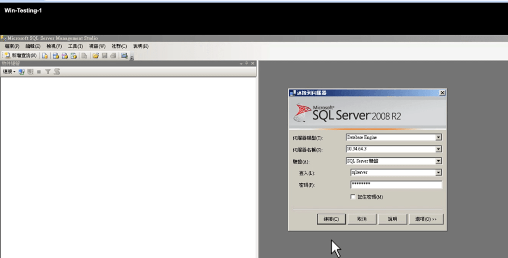 登入GCVE裏的Windows VM,啟動SSMS工具,登到10.34.64.3的DB主機,並用MS SQL的DB user和password驗證連線。