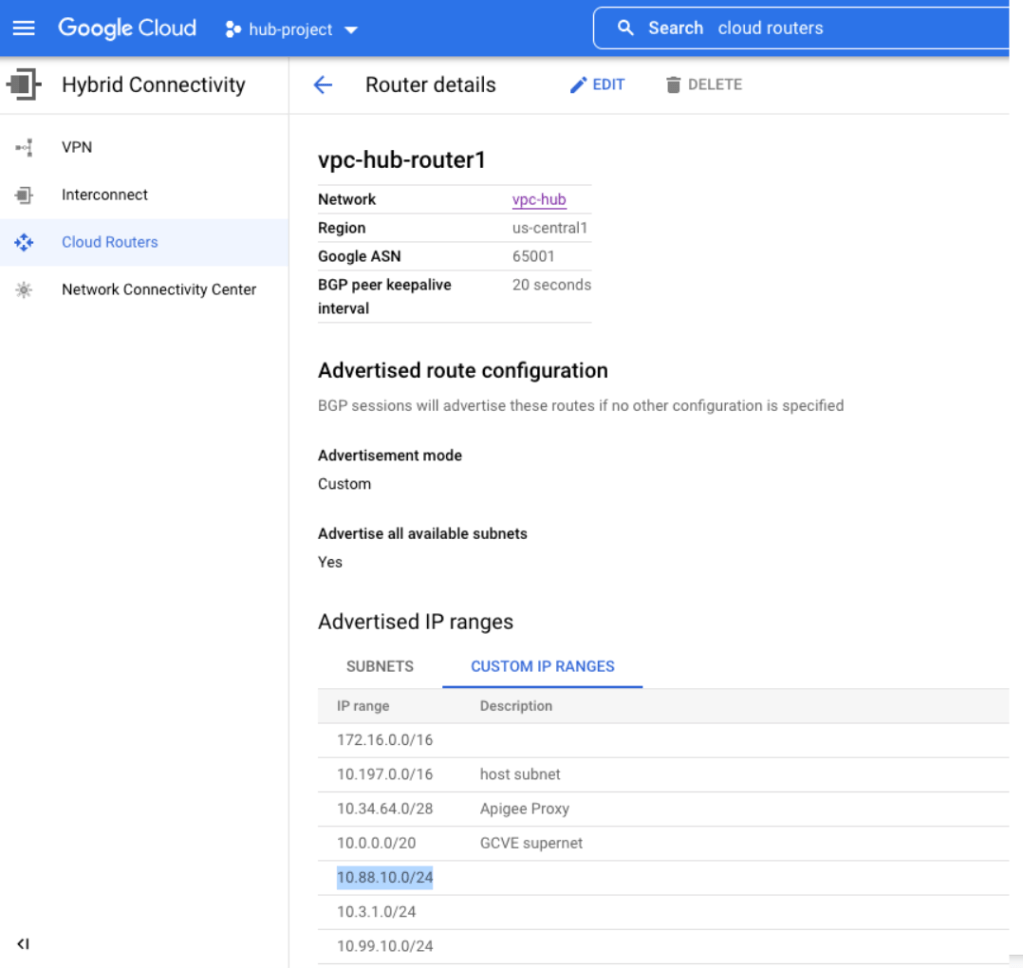 再到GCP VPC內檢查一下我們已經有將GCVE的10.88.10.0/24這個網段加入Cloud Routers內。
