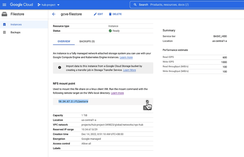 如下所示,我們在專案中建了一個名為”gcve-filestore”的Filestore,它export出來的mount point是“10.34.67.2:/filestore”
